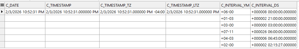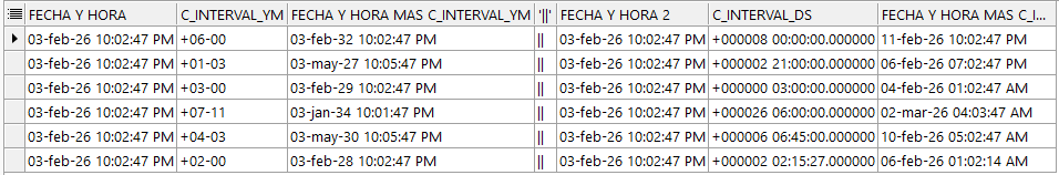 | INTERVAL DAY TO SECOND | Permite que se almacene la hora como intervalo de días, horas, minutos y segundos Se utiliza para representar la diferencia precisa entre dos valores de fecha/hora. |