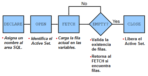 En el diagrama de flujo anterior: Luego de cada búsqueda(FETCH), se prueba la existencia de filas en el cursor. Si no hay más filas para procesar, se debe cerrar el cursor.