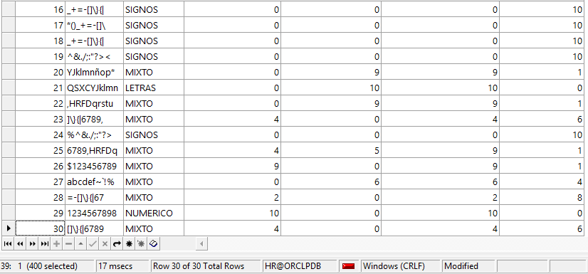 Usamos un Bloque Anónimo de PL/SQL para insertar 30 registros a nuestra tabla. Registro a continuación:
