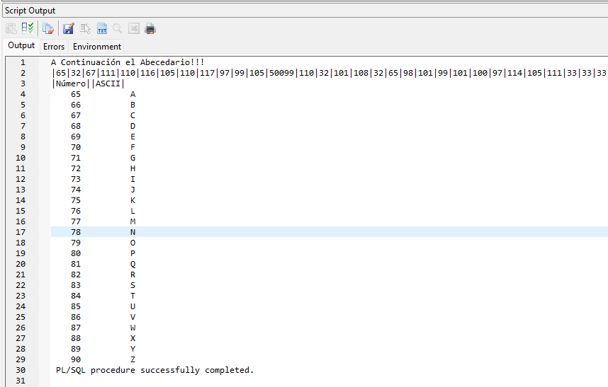 DBMS_OUTPUT.PUT_LINE('|Número|'||'|ASCII|');