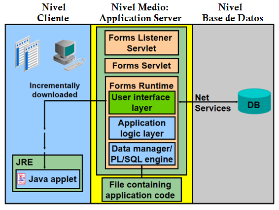 Oracle Forms Services utiliza una arquitectura de tres niveles para implementar aplicaciones de Base de Datos: