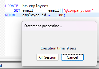 El bloque PL/SQL anterior consulta todas las sesiones de base de datos diferentes a la sesión actual y utiliza las sentencias KILL SESSION y DISCONNECT SESSION para eliminarlas o desconectarlas.