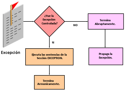 Debe incluir una sección de excepciones en su programa PL/SQL para atrapar excepciones. Si la excepción se levanta en la sección ejecutable del bloque, el flujo se mueve al control correspondiente dentro de la sección EXCEPTION. Si PL/SQL maneja con éxito la excepción, está no se propaga al ambiente y el bloque PL/SQL termina con éxito.