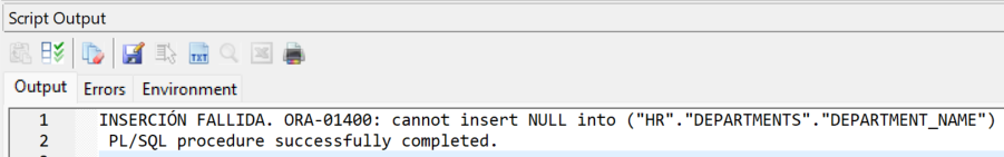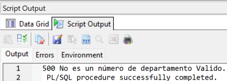 El ejemplo trata de actualizar el department_name de un departamento. Si no existe el número de departamento suministrado, no se actualizan filas en la tabla de departments y ninguna excepción se dispara por defecto; como vemos en el ejemplo, por medio de las excepciones definidas por el usuario, podemos cambiar ese comportamiento, esto permite informar al usuario si la actualización fue exitosa.