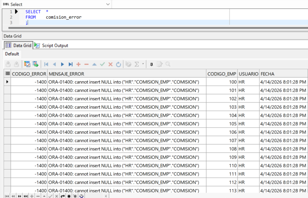 El ejemplo trata de insertar la comisión de cada empleado en la tabla comision_emp, pero dicha tabla tiene todos los campos NOT NULL y no todos los empleados tienen comisión, por lo cual es de esperar errores con algunos registros; para tener control de esto, agregamos un control de excepciones que insertara los registros con errores en la tabla: comision_error. Nota: si ejecuta el SCRIPT dos veces el error cambiaría: ORA-00001: unique constraint (HR.PK_COMI) violated.