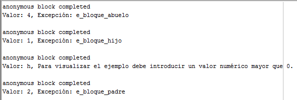 DBMS_OUTPUT.PUT_LINE('Valor: '||v_entrada||', Excepción: e_bloque_padre');
