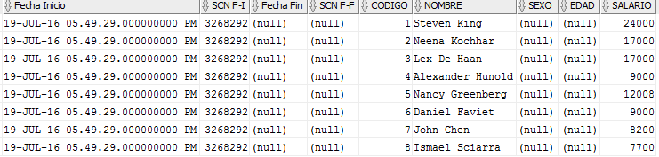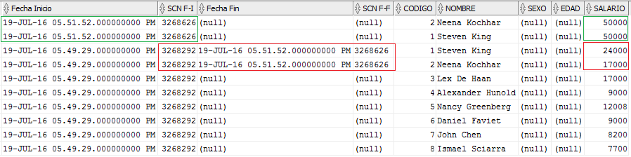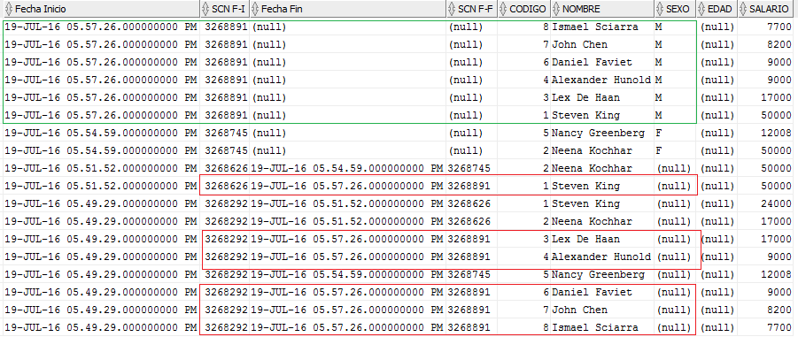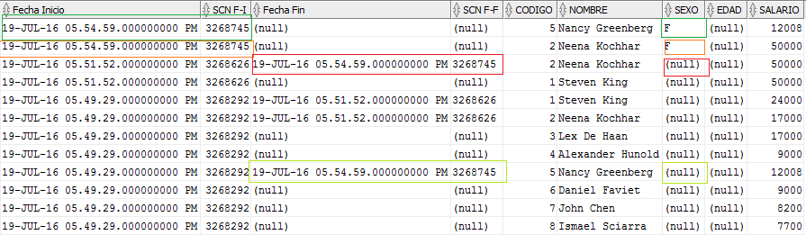 La imagen muestra como identificar las versiones mas recientes de la data; Notar que los registros con valores no Nulos en los campos Fecha Fin y SCN F-F(encerrados en Rojo) son equivalentes a los valores de Fecha Inicio y SCN F-I de las versiones mas recientes.