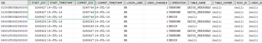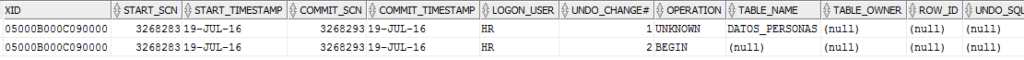 Consultamos los cambios realizados en la tabla datos_personas, pero ahora a través de la Vista: flashback_transaction_query. Nota: Uso el SCN retornado en el primer ejemplo como rango inferior y una fecha mayor como rango superior, si ejecutas el mismo Query debes cambiar los rangos de acuerdo a tu necesidad(para evitar error usar: MINVALUE AND MAXVALUE).