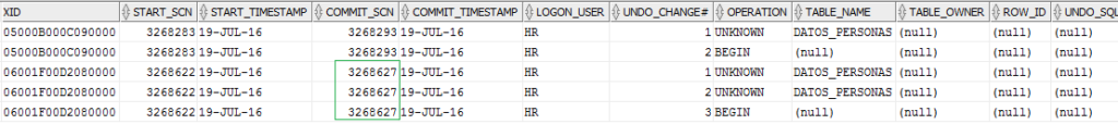 Consultamos una vez mas la Vista: flashback_transaction_query; los registros encerrados en verde equivalen a nuestra ultima actualización en la tabla datos_personas .