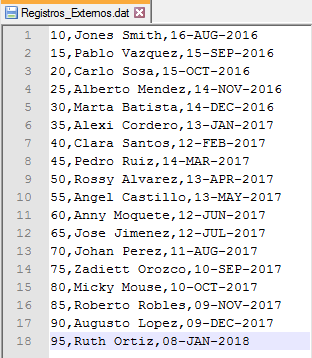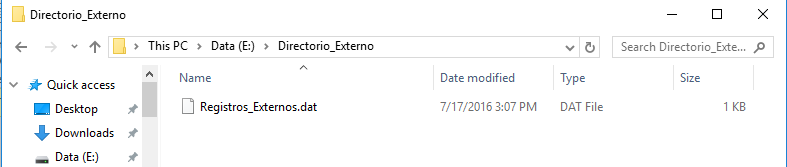 Creamos una carpeta llamada: Directorio_Externo; ruta: ‘E:\Directorio_Externo‘ y colocamos ahi el archivo Registros_Externos.dat con lo registros mostrados anteriormente.